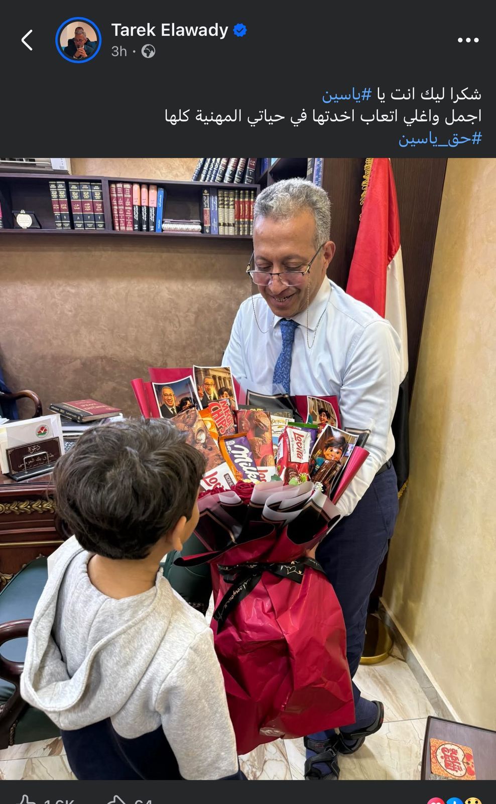 الطفل ياسين يقدم بوكيه شيكولاتة لمحاميه طارق العوضى تعبيرا عن امتنانه