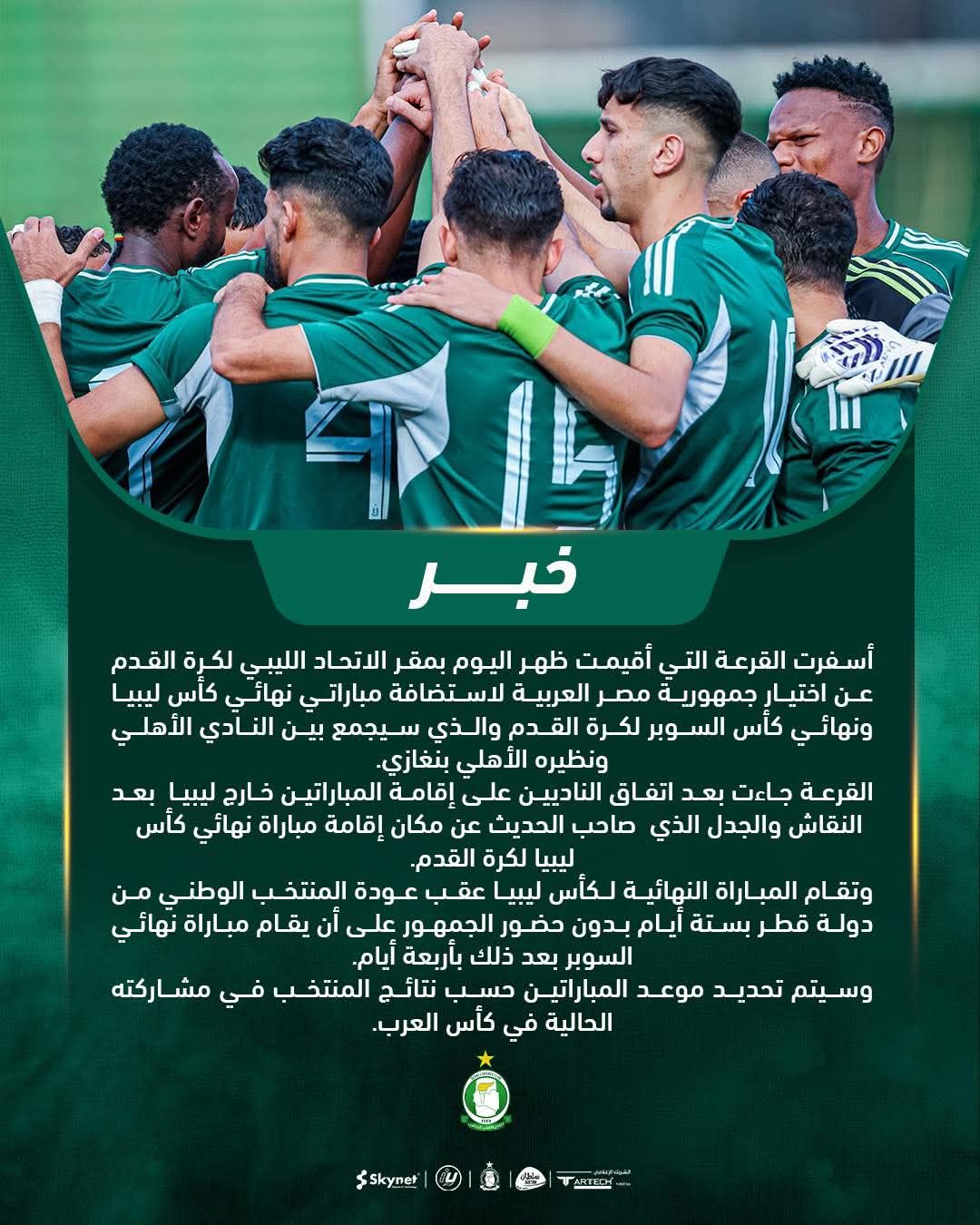 وقال نادي اهلي طرابلس عبر حسابه الرسمي بموقع فيس بوك أن المباراة النهائية في بطولة كأس ليبيا ستقام بعد مرور ستة أيام على نهاية مشاركة منتخب ليبيا في بطولة كأس العرب التي تنطلق في قطر الأثنين المقبل.