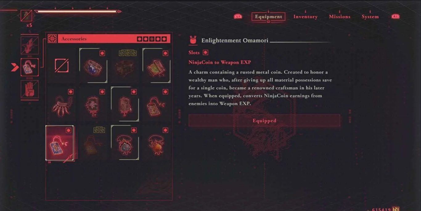 هذا الإكسسوار يحوّل كل NinjaCoin المكتسب مباشرة إلى خبرة أسلحة، مما يسرّع عملية الترقية بشكل كبير.
