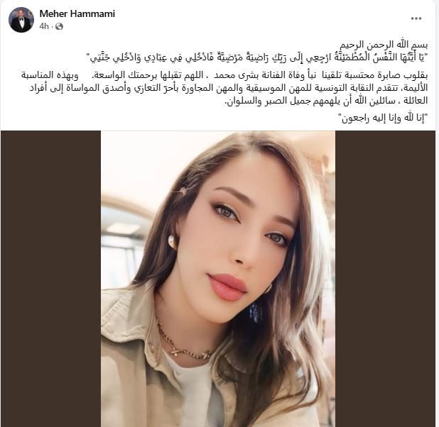 الخميس، 27 نوفمبر 2025 04:12 مكشف ماهر همامي نقيب المهن الموسيقية في تونس، عن وفاة الفنانة التونسية بشرى محمد، حيث كتب عبر حسابه بموقع فيس بوك "يَا أَيَّتُهَا النَّفْسُ الْمُطْمَئِنَّةُ ارْجِعِي إِلَى رَبِّكِ رَاضِيَةً مَرْضِيَّةً فَادْخُلِي فِي عِبَادِي وَادْخُلِي جَنَّتِي" بقلوب صابرة محتسبة تلقينا نبأ وفاة الفنانة بشرى محمد، اللهم تقبلها برحمتك الواسعة".