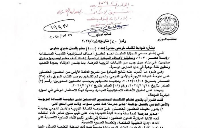 أصدر وزير التربية والتعليم والتعليم الفني الكتاب الدوري رقم (20) بتاريخ 27 يناير 2025، بشأن ضوابط تكليف خريجي مبادرة إعداد (1000) معلم للعمل بوظيفة مدير مدرسة، وذلك في إطار توجه الوزارة لتعزيز القيادات التربوية وتحقيق أهداف رؤية مصر 2030 في تطوير التعليم.