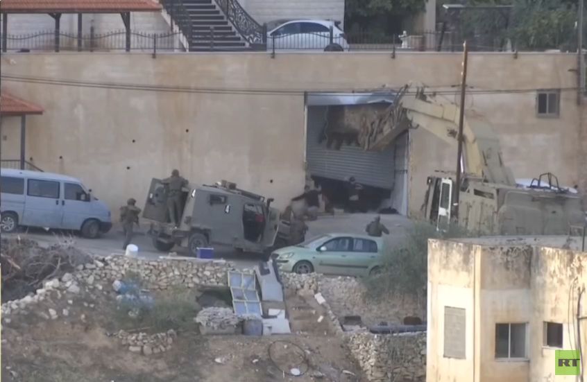وأظهرت اللقطات قيام جرافة عسكرية تابعة للجيش بهدم مدخل مخزن داخل أحد المنازل المحاصرة، قبل أن يخرج شابان فلسطينيان رافعين أيديهما مستسلمين.