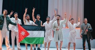 الجمعة، 28 نوفمبر 2025 02:10 مرفع القائمون على عرض المسرحية الأردنية "حمام الهنا" المشاركة ضمن فعاليات مهرجان أيام قرطاج المسرحية في دورته الـ٢٦، العلم الفلسطيني بعد انتهاء العرض المسرحي على المسرح البلدي في وسط العاصمة التونسية.