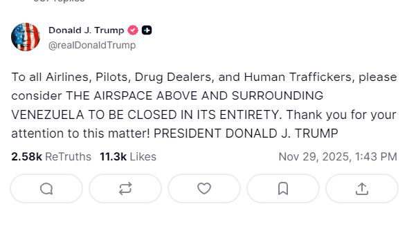 وكتب ترامب في منشور عبر منصته “تروث سوشيال”، السبت: “إلى جميع شركات الطيران والطيارين وتجار المخدرات والمتاجرين بالبشر، يُرجى اعتبار المجال الجوي فوق فنزويلا ومحيطها مغلقا بشكل كامل، شكرًا لاهتمامكم بهذا الموضوع!”.