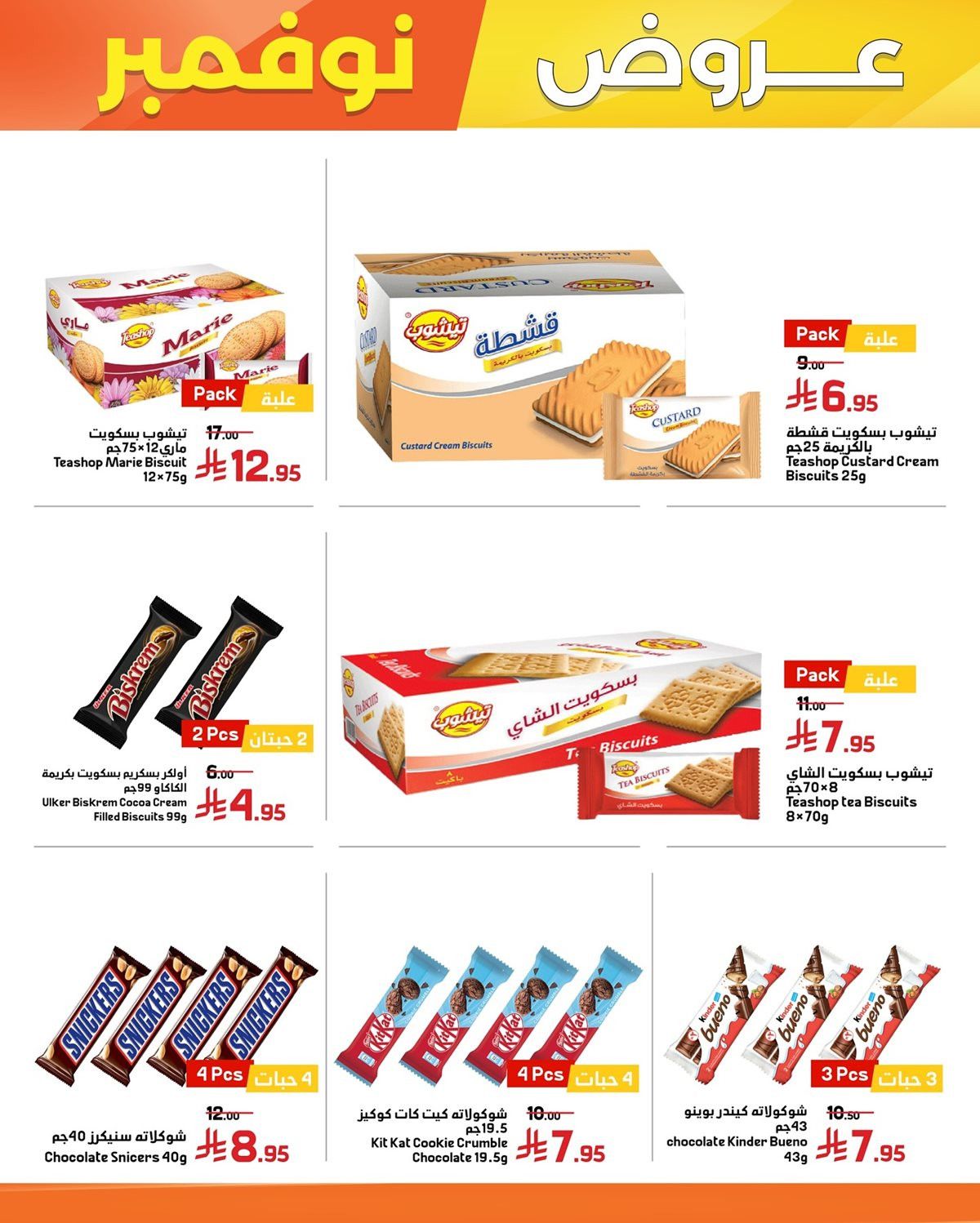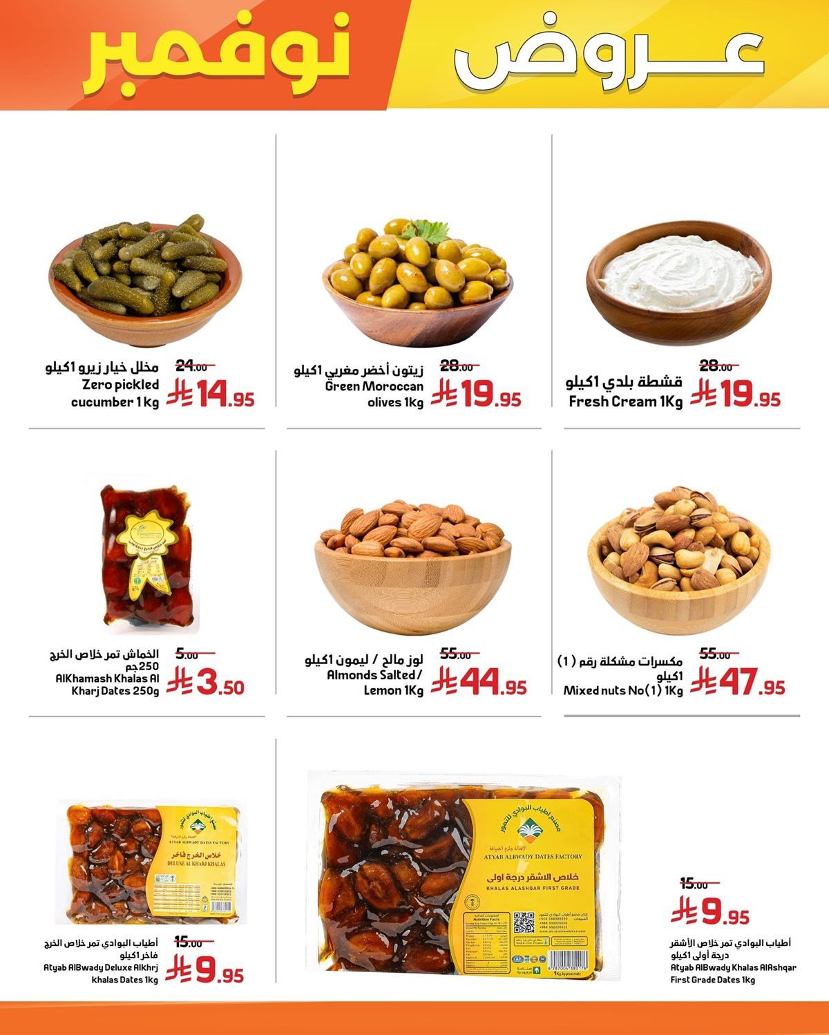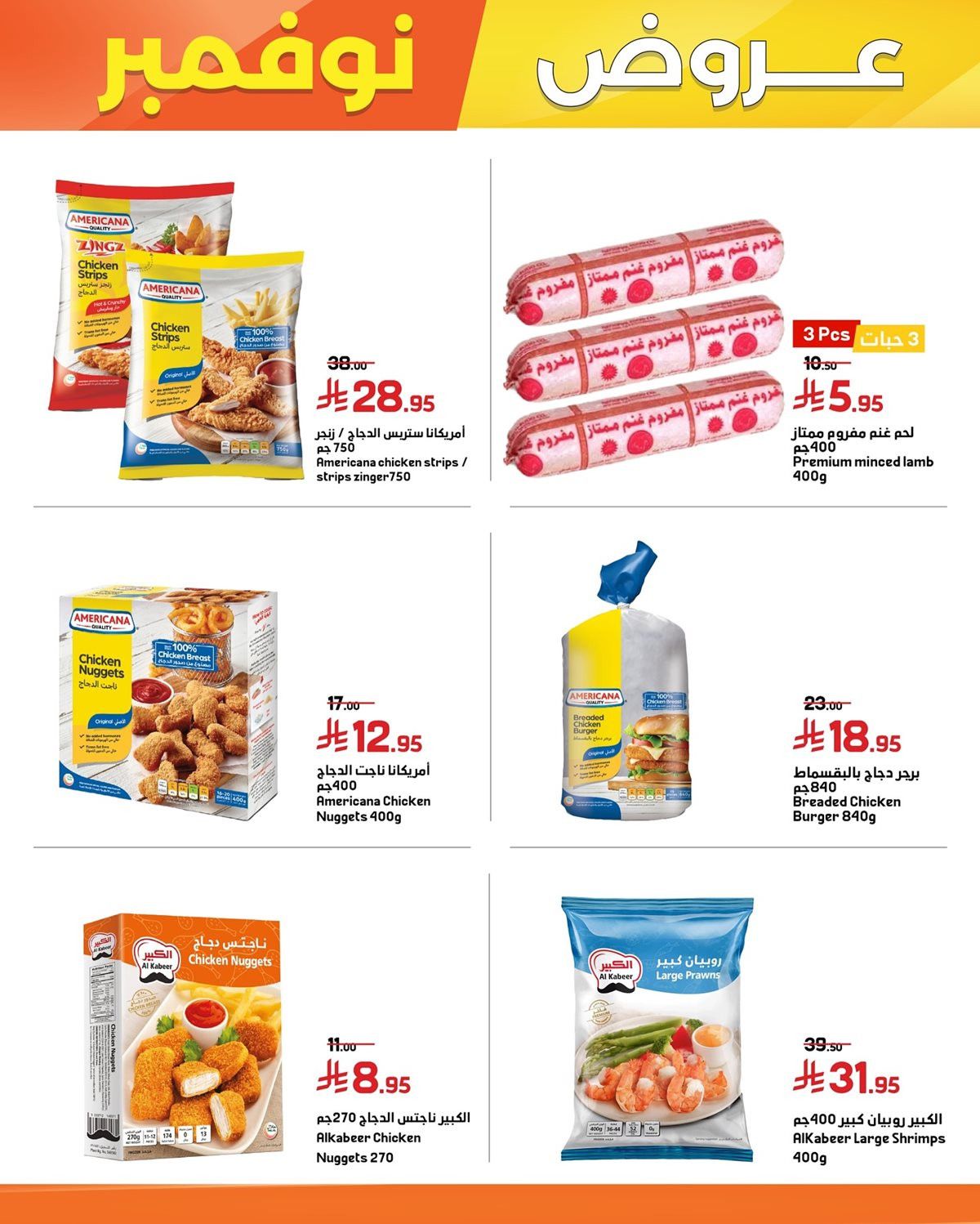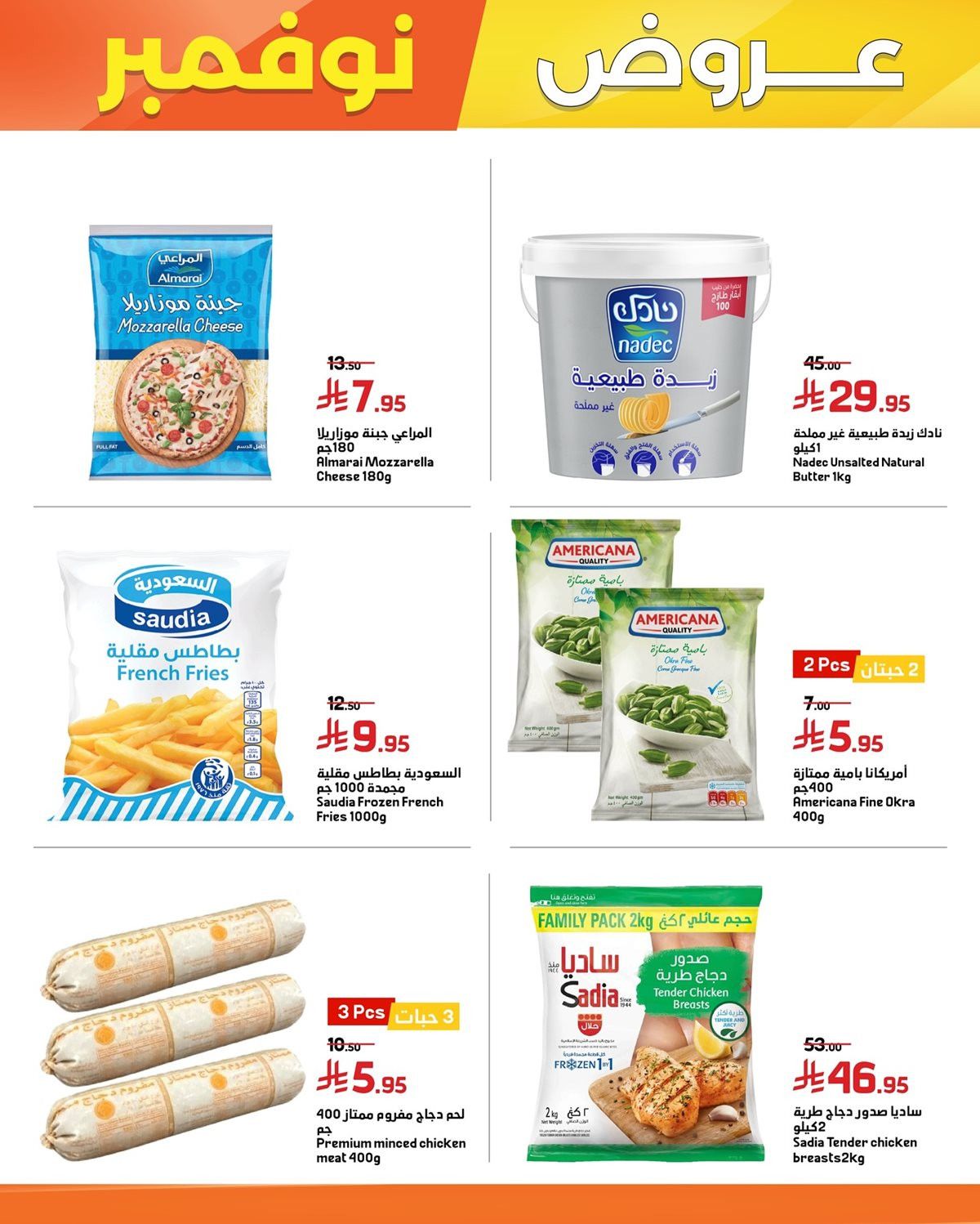 عروض اسواق العامر مستمرة حتي الثلاثاء 2-12-2025 و بتحتوي علي قطع الدجاج المختلفة من ستربس وناغتس وبرغر إضافة إلى الروبيان والخضار المجمدة والبطاطس وأنواع الجبن والزبدة واللحوم المفرومة إلى جانب التمور والمكسرات المتنوعة والزيتون والمخللات والقشطة والمنتجات المعلبة مثل الفول والحمص ومعجون الطماطم