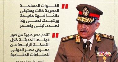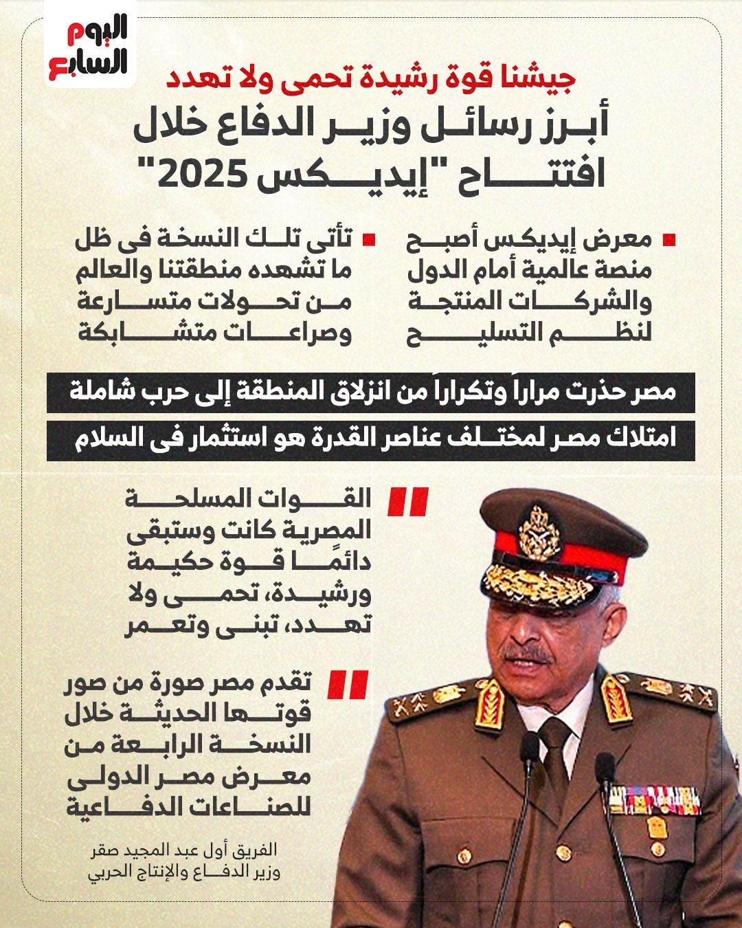 وتحدث وزير الدفاع عن افتتاح المتحف المصري الكبير كشاهد على عظمة مصر، وعن ما تقدمه مصر اليوم من صورة لقوتها الحديثة عبر معرض "إيديكس"، مؤكداً حرص الدولة على مواكبة التطورات العالمية في مجال التسليح وتعزيز القدرة العسكرية بما يدعم الأمن القومي.