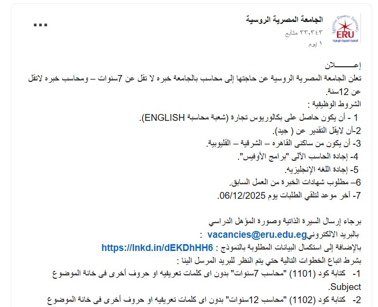 تعلن الجامعة المصرية الروسية عن حاجتها إلى محاسب بالجامعة خبره لا تقل عن 7سنوات ومحاسب خبره لاتقل عن 12سنة.