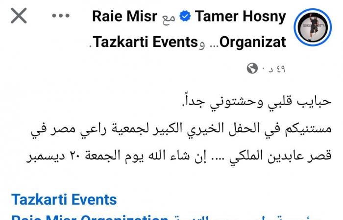 ونشر تامر حسني بوستر حفله، عبر حسابه الشخصي بموقع التواصل الاجتماعي فيسبوك، وعلق قائلا: “حبايب قلبي وحشتوني جدًا، مستنيكم في الحفل الخيري الكبير لجمعية راعي مصر في قصر عابدين الملكي، إن شاء الله يوم الجمعة 20 ديسمبر، مؤسسة راعي مصر للتنمية".
