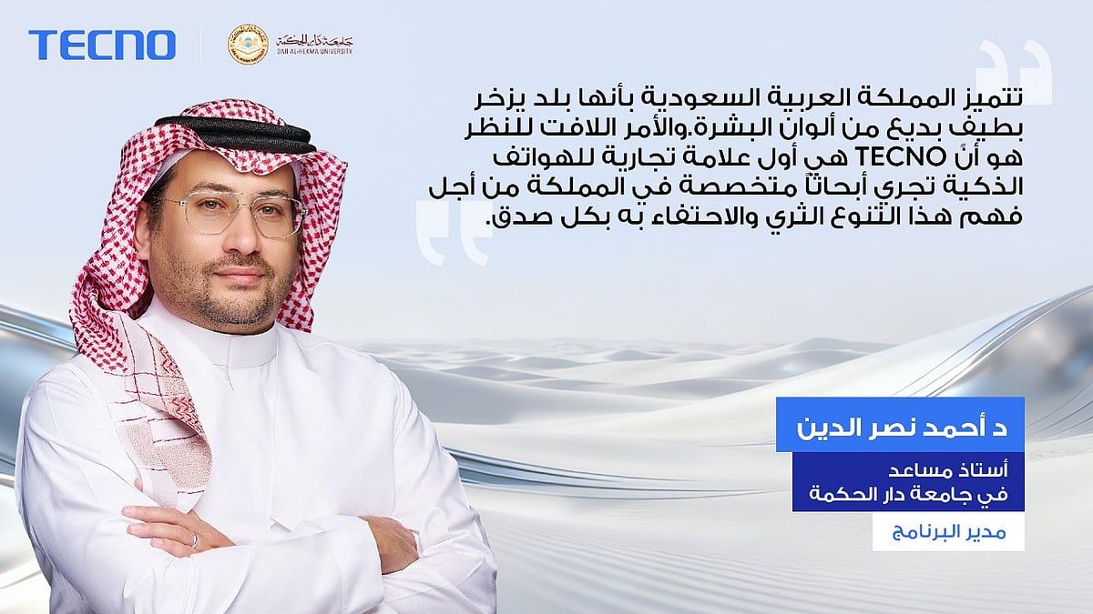 ومن جانبه، أشار البروفيسور أحمد ناصر الدين، الأستاذ المساعد في جامعة دار الحكمة، "المملكة دولة غنية بمجموعة جميلة من ألوان البشرة. وما يثير الدهشة هو أن TECNO هي العلامة التجارية الأولى والوحيدة للهواتف الذكية التي تجري أبحاثاً مخصصة هنا لفهم هذا التنوع الحقيقي والاحتفاء به. ونحن فخورون بالمشاركة في هذه المبادرة الرائدة، التي توفر وجهات نظر محلية تساعد في تشكيل التكنولوجيا التي تمثل سكان المملكة بشكل أصيل."