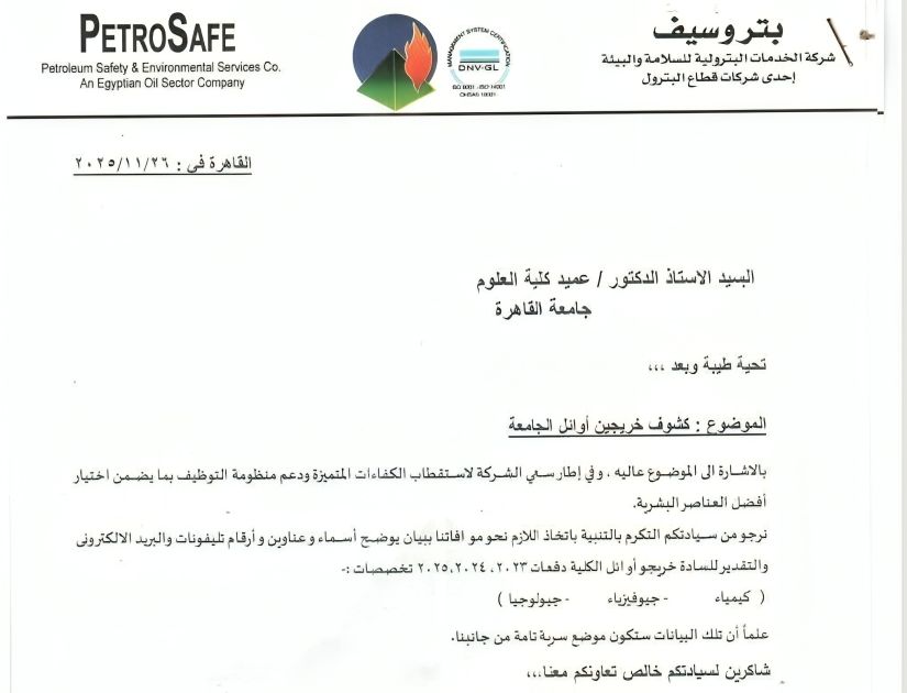 وردنا هذا الاعلان رسميا من شركة بتروسيف بشأن وجود فرص عمل لأوائل اقسام جيولوجيا و كيمياء و جيوفيزياء دفعات 2023-2024-2025 -