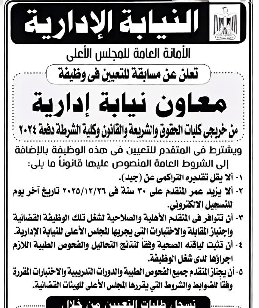 النيابة الإدارية الأمانة العامة للمجلس الأعلى تعلن عن مسابقة للتعيين في وظيفة معاون نيابة إدارية من خريجي كليات الحقوق والشريعة والقانون وكلية الشرطة دفعة 2024 ويشترط في المتقدم للتعيين فى هذه الوظيفة بالإضافة إلى الشروط العامة المنصوص عليها قانوناً ما يلى: