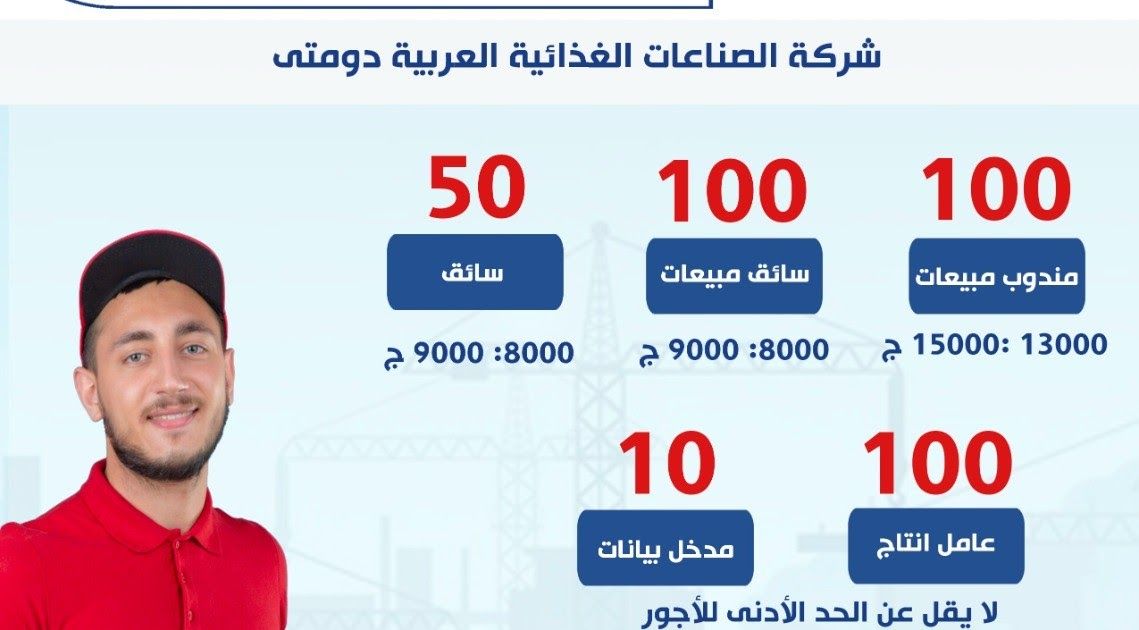 وزارة العمل تُعلن عن 360 فرصة عمل جديدة بشركة الصناعات الغذائية العربية «دومتى».. بالتعاون مع مديرية عمل الجيزة..