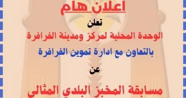 الجمعة، 05 ديسمبر 2025 09:00 صأعلنت الوحدة المحلية لمركز ومدينة الفرافرة بمحافظة الوادى الجديد بالتعاون مع ادارة تموين الفرافرة عن مسابقة المخبز البلدى المثالى لشهر ديسمبر 2025 وذلك من خلال المرور المفاجئ والدورى للجان مختصة لتقييم المخابز البلدية واختيار افضلها بنهاية الشهر على أن يتم اعلان المخبز الافضل نهاية شهر ديسمبر الجارى.