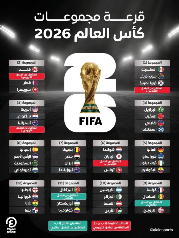 أسفرت قرعة دور المجموعات لبطولة كأس العالم 2026 عن تواجد المنتخبات العربية المشارك في البطولة بمجموعات قوية للغاية، فيما عدا منتخب مصر الذي أوقعته القرعة ضمن أسهل مجموعات البطولة.