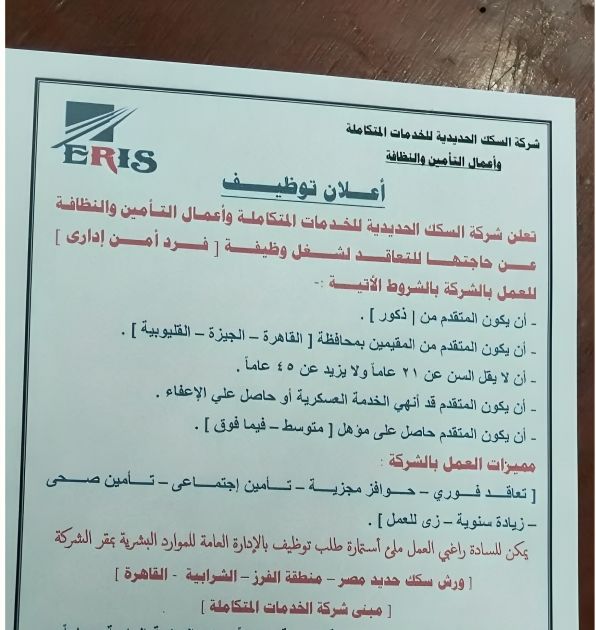 شركة السكك الحديدية للخدمات المتكاملة وأعمال التأمين والنظافة أعلان توظيف تعلن شركة السكك الحديدية للخدمات المتكاملة وأعمال التأمين والنظافة عن حاجتها للتعاقد لشغل وظيفة [ فــــــرد أمن إدارى ] للعمل بالشركة