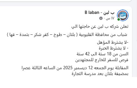 اعلان توظيف شركة بلبن للشباب حديثى التخرج لا يشترط خبرة سابقة والتقديم يوم الجمعة لهذه الوظائف