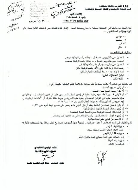 تنويه هام بشأن الوظائف المعلن عنها بهيئة الطاقة المتجددة بوزارة الكهرباء والطاقة المتجددة. نظرًا لورود العديد من الاستفسارات من المتابعين حول الإعلان السابق المتعلق بوظائف مهندس – محاسب – سائق بهيئة الطاقة المتجددة، نود التوضيح بأن الجهة المختصة تشترط تقديم إقرار رسمى ضمن المستندات المطلوبة، وذلك وفقًا لضوابط التقديم المعتمدة