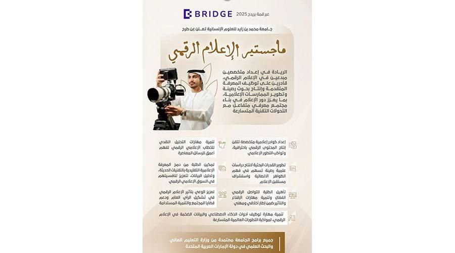 أطلقت جامعة محمد بن زايد للعلوم الإنسانية، برنامج الماجستير في الإعلام الرقمي، لتعزيز إسهاماتها في بناء مجتمع معرفي متفاعل مع التحولات التقنية المتسارعة، ودعم رؤيتها في التوسع في مجال الدراسات العليا، لتشمل مساقات علمية حيوية تمكّن الطلاب من الإبداع والابتكار والتفكير والقدرة على المبادرة، إلى جانب تعزيز ريادتها في مختلف مجالات العلوم الإنسانية والاجتماعية.