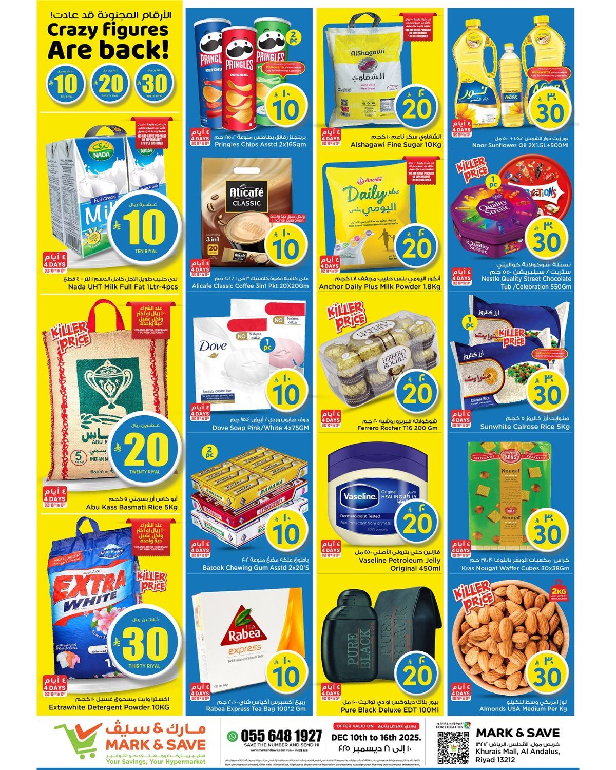 عروض مارك أند سيف الرياض الخميس 11/12/2025 تبدأ بالأجهزة مثل قدر ضغط وخلاط يدوي ومفرمة خضار وقطاعة توست وغلاية ماء و بتوفر كمان الجزر والبصل والفلفل والبطاطس وتشمل الفواكه الموز والتفاح الجالا ثم اللحوم مثل الدجاج وقطع اللحم والسمك السردين إضافة إلى الأرز والحليب والجبنة و بارخص الاسعار المناسبة للجميع