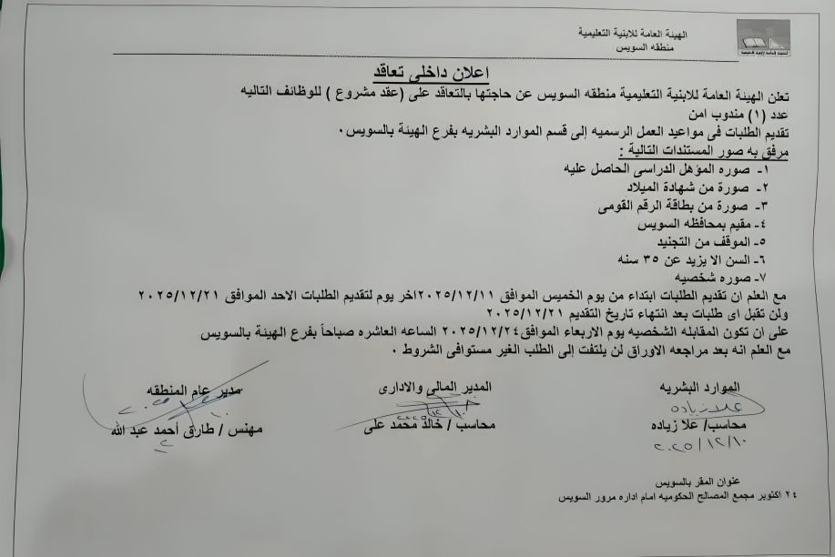 الهيئة العامة للابنية التعليمية منطقه السويس اعلان داخلی تعاقد تعلن الهيئة العامة للابنية التعليمية منطقة السويس عن حاجتها بالتعاقد على ( عقد مشروع ) للوظائف التاليه عدد (۱) مندوب امن
