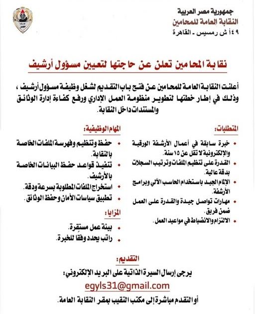 نقابة المحامين تعلن عن حاجتها لتعيين مسؤول أرشيف أعلنت النقابة العامة للمحامين عن فتح باب التقديم لشغل وظيفة مسؤول أرشيف، وذلك في إطار خطتها لتطوير منظومة العمل الإداري ورفع كفاءة إدارة الوثائق والمستندات داخل النقابة.