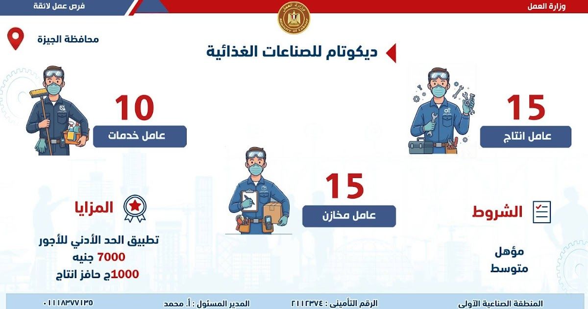 كما أعلنت الوزارة عن فرص عمل بشركة ديكوتام للصناعات الغذائية بالمنطقة الصناعية الأولى