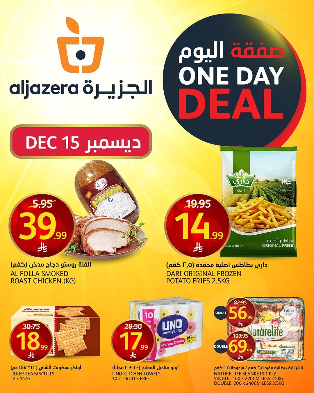 عروض اسواق الجزيرة الطازج الاثنين 15-12-2025 بتقدم ليكم اقوي التخفيضات علي منتجات متنوعة منها داري بطاطس اصلية مجمدة و الفلة روستو دجاج مدخان بالاضافة الي اونو مناديل المطبخ و غيرها من المنتجات و باسعار رائعة مناسبة للجميع انتهز الفرصة و اشتر الان العرض متاح اليوم فقط
