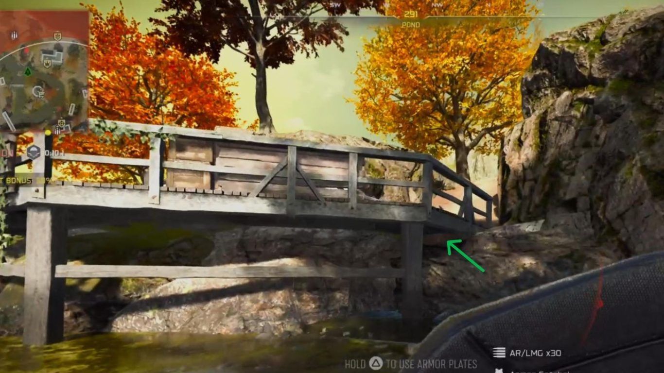 ويتركز ظهور العظم تحديدًا تحت الأرصفة الخشبية المنتشرة حول البركة إذ تمتد هذه الأرصفة على شكل ممرات خشبية مختلفة الأحجام وتُعد المساحات أسفلها هي الأماكن الوحيدة التي قد يتولد فيها عنصر العظم ولهذا يجب الزحف للأسفل أو الانحناء Crouch عند الاقتراب من كل رصيف حتى تتضح لك الرؤية لأن العنصر لا يظهر بالكامل من بعيد بل يلمع بلون برتقالي عند الاقتراب منه فقط مما يجعل الانتباه للتفاصيل البصرية أمرًا ضروريًا.