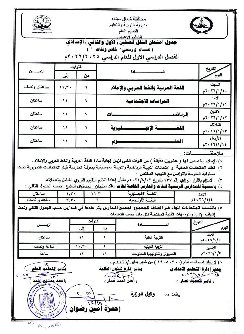 وقّع حمزة رضوان، وكيل وزارة التربية والتعليم بمحافظة شمال سيناء، جداول امتحانات الفصل الدراسي الأول للعام الدراسي 2025 / 2026، وذلك عقب الانتهاء من مراجعتها بشكل كامل واعتمادها رسميًا، وفقًا للخريطة الزمنية المعتمدة من وزارة التربية والتعليم والتعليم الفني.
