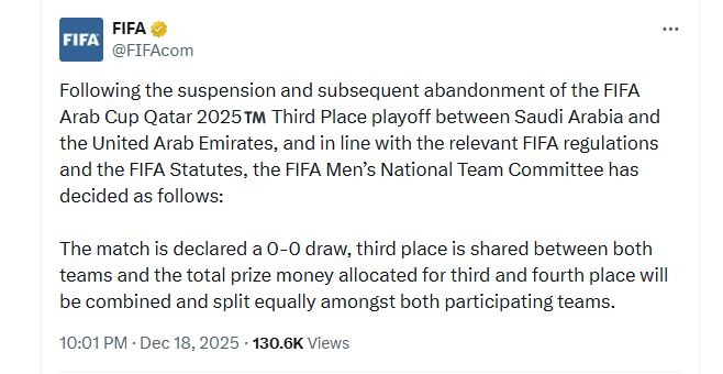 وأضاف عقل في تليفزيون اليوم السابع أن الاتحاد الدولي لكرة القدم فيفا أصدر بيانا منذ قليل أعلن فيها حسم مصير بروزنزية كأس العرب بين منتخبي السعودية والإمارات بشكل رسمي باعتماد نتيجة التعادل السلبي وتقاسم المركز الثالث بين منتخبي السعودية والإمارات، على أن يتم دمج الجوائز المالية الخاصة بالمركزين الثالث والرابع وتقسيمها بالتساوي بين المنتخبين.