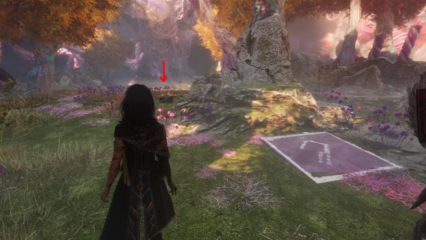 بعد تحديد موقع الشجرة الوردية الكبيرة يجب على اللاعب التوجه إليها عبر المسار الأقرب مع الانتباه للتضاريس المحيطة مثل الأرض غير المستوية أو العناصر البيئية التي قد تعيق الحركة أثناء الاقتراب.