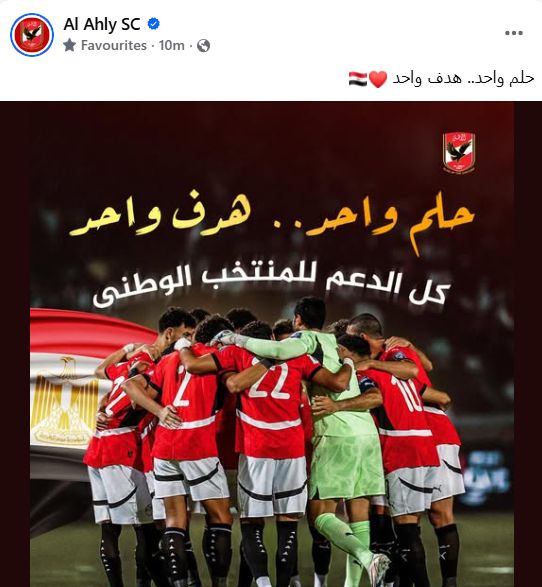 وكتبت الصفحة الرسمية للنادي الأهلي عبر حسابها على فيسبوك: "حلم واحد.. هدف واحد.. كل الدعم للمنتخب الوطني".