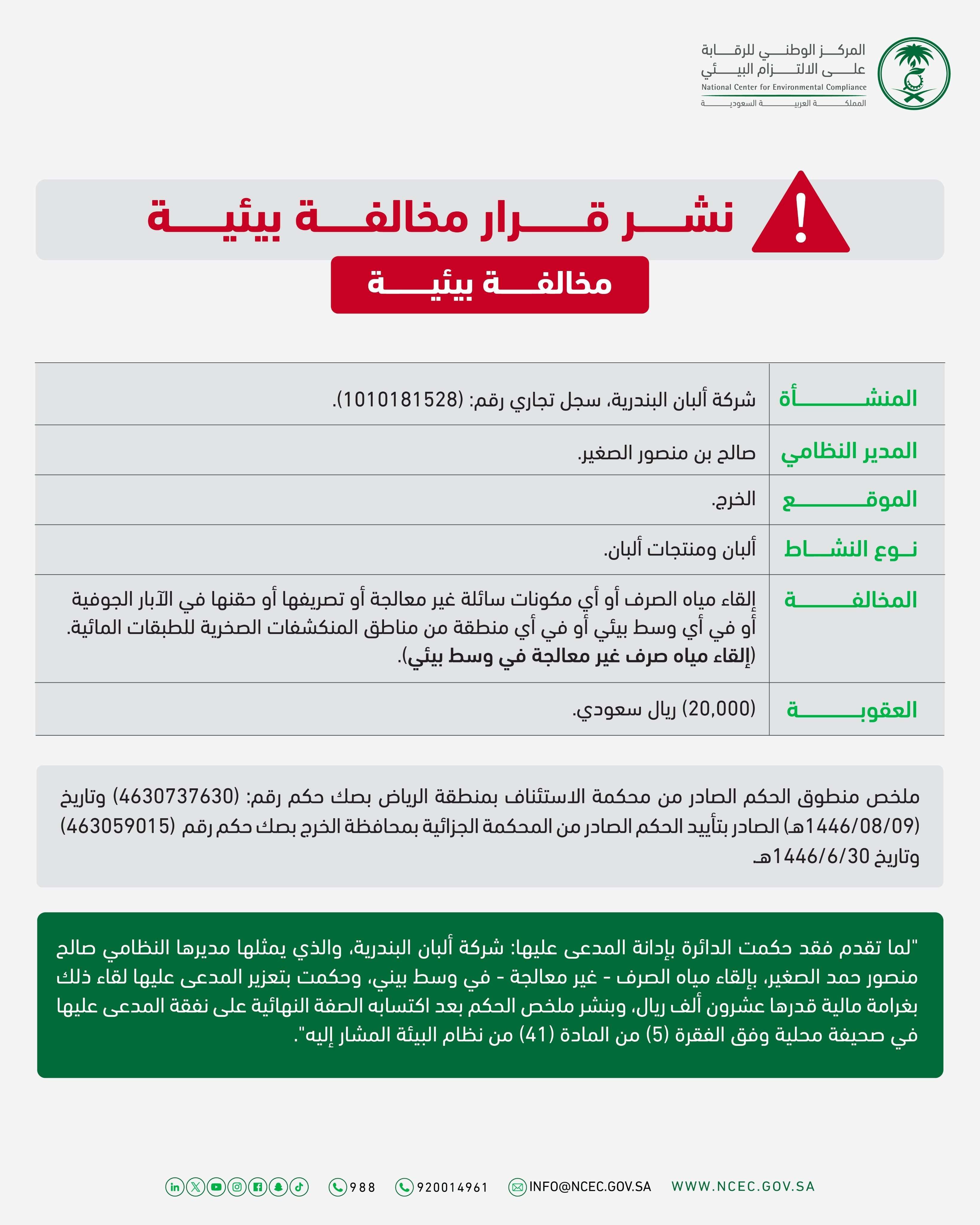 أصدر المركز الوطني للرقابة على الالتزام البيئي قرارًا يقضي بفرض مخالفة بيئية بحق شركة ألبان البندرية بمحافظة الخرج، شملت غرامة مالية والتشهير بالمخالف؛ نتيجة مخالفة نظام البيئة ولوائحه التنفيذية.