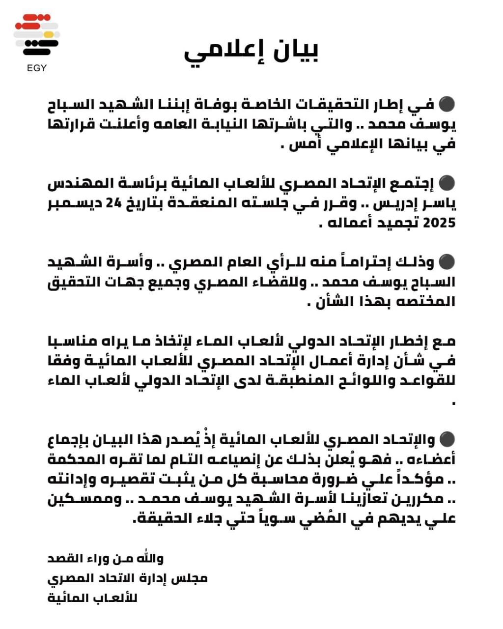 الأربعاء، 24 ديسمبر 2025 10:37 مفي إطار التحقيقات الخاصة بوفاة إبننا الشهيد السباح يوسف محمد والتي باشرتها النيابة العامة وأعلنت قرارتها في بيانها الإعلامي أمس اجتمع الاتحاد المصري للألعاب المائية برئاسة المهندس ياسر إدريس وقرر في جلسته المنعقدة بتاريخ 24 ديسمبر 2025 تجميد أعماله، وجاء ذلك القرار احتراماً للرأي العام المصري وأسرة الشهيد السباح يوسف محمد وللقضاء المصري وجميع جهات التحقيق المختصه بهذا الشأن.
