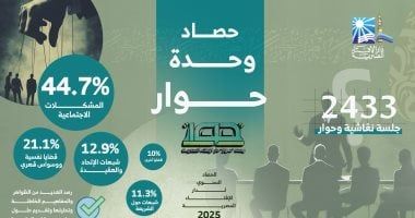 وفي هذا السياق، أعلنت وحدة «حوار» أن إجمالي عدد الحالات التي تعاملت معها خلال الفترة من 1 يناير 2025 حتى ديسمبر 2025 بلغ (2433) حالة، تنوعت ما بين قضايا فكرية ودينية واجتماعية ونفسية، وتوضح الإحصاءات أن المشكلات الاجتماعية استحوذت على النصيب الأكبر من إجمالي الحالات، بعدد (1088) حالة بنسبة 44.7%، في حين سجلت الوحدة (27) حالة عنف منزلي بنسبة 1.1%، و(12) حالة تحرش بنسبة 0.5%، و(35) حالة مرتبطة بالمخدرات بنسبة 1.4%.