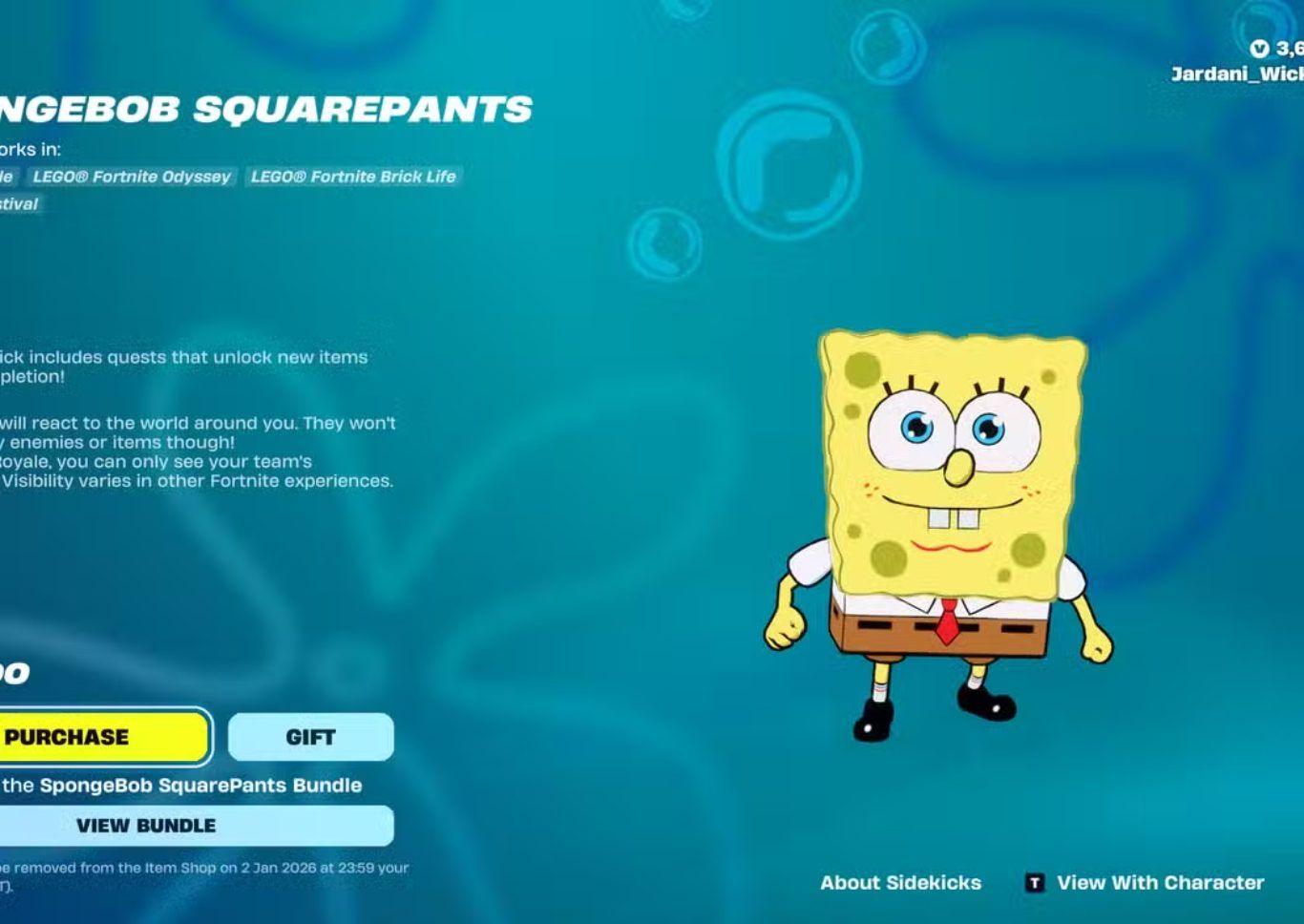 يظهر SpongeBob SquarePants في لعبة Fortnite على هيئة Sidekick يمكن للاعبين شراؤه مباشرة من Item Shop مقابل 1800 V Bucks. هذا العنصر يُعد رفيقًا دائمًا يرافق اللاعب داخل المباريات ويضيف طابعًا بصريًا مرحًا مستوحى من الشخصية الأصلية دون التأثير على أسلوب اللعب التنافسي.