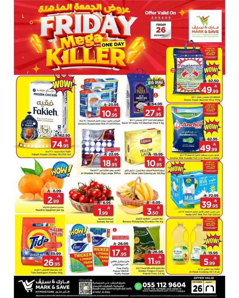 عروض مارك اند سيف الاحساء اليوم الجمعة 26 ديسمبر 2025 بتقدم تشكيلة من المنتجات منها دجاج فقيه المجمد وحليب مبخر المراعي وأرز بسمتي وحليب بودرة أنكور مع كرتون حليب ندى طويل الأجل كما تشمل بيض المائدة الطازج وشاي ليبتون يلو لابز البراد والبرتقال المصري والطماطم الطازجة والموز الفلبيني ومسحوق غسيل تايد