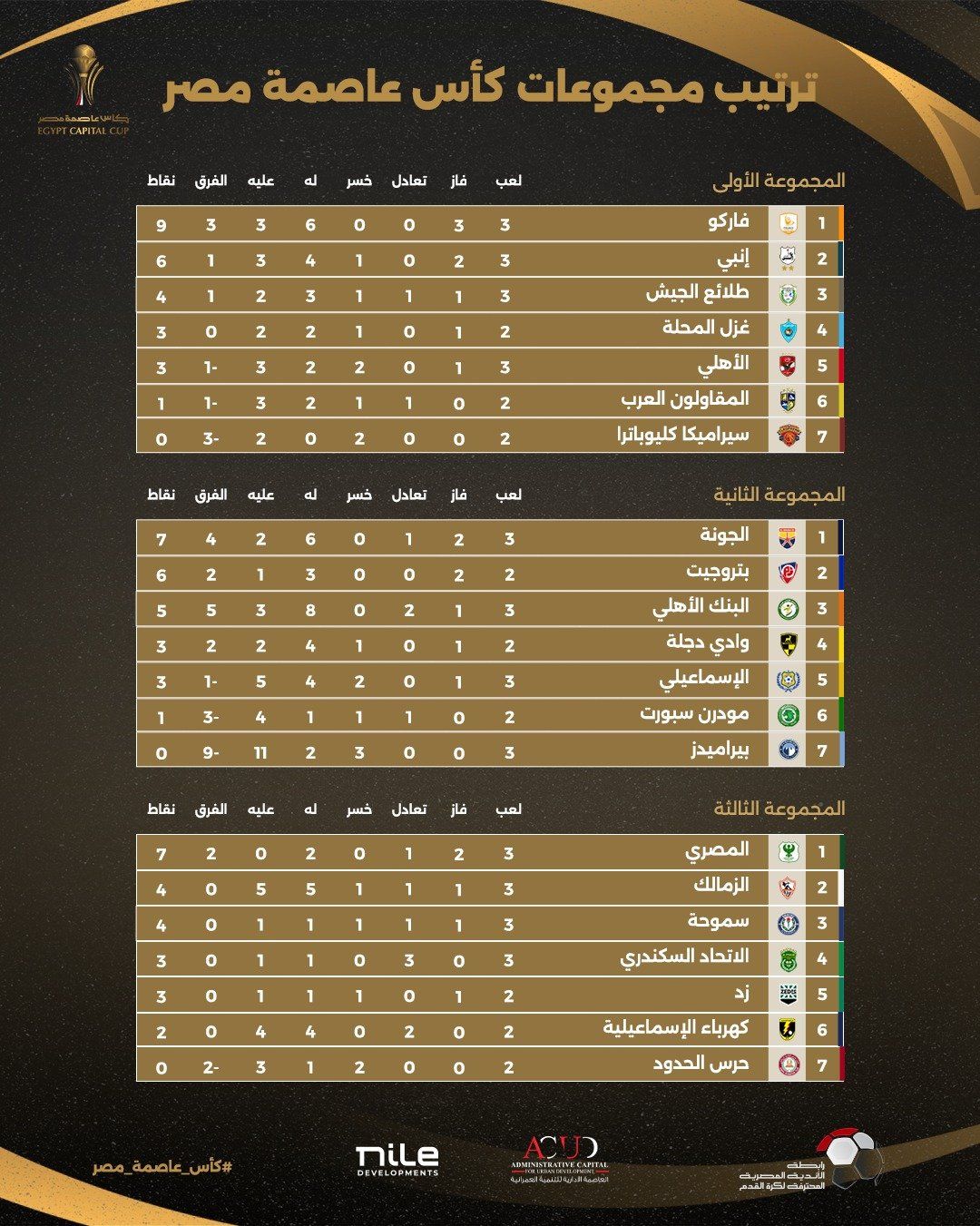 المجموعة الأولى: الأهلي – سيراميكا – فاركو – طلائع الجيش – إنبي – غزل المحلة – المقاولون العرب.