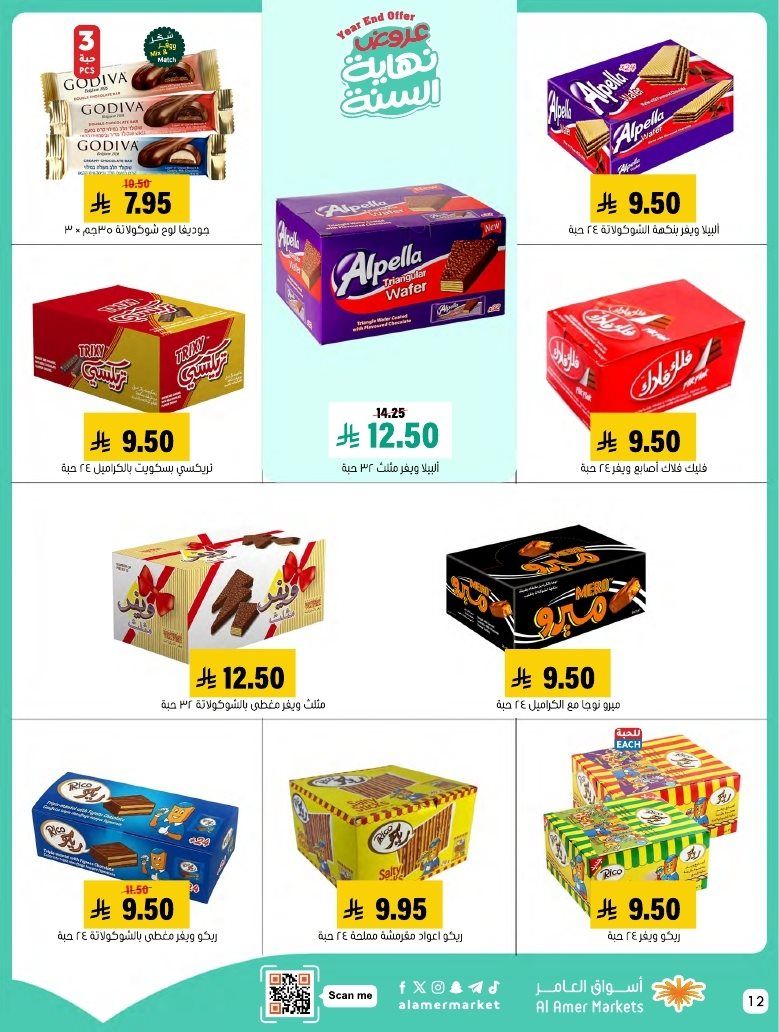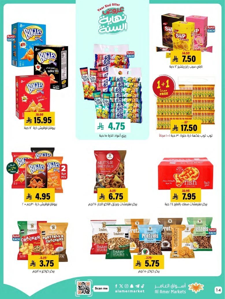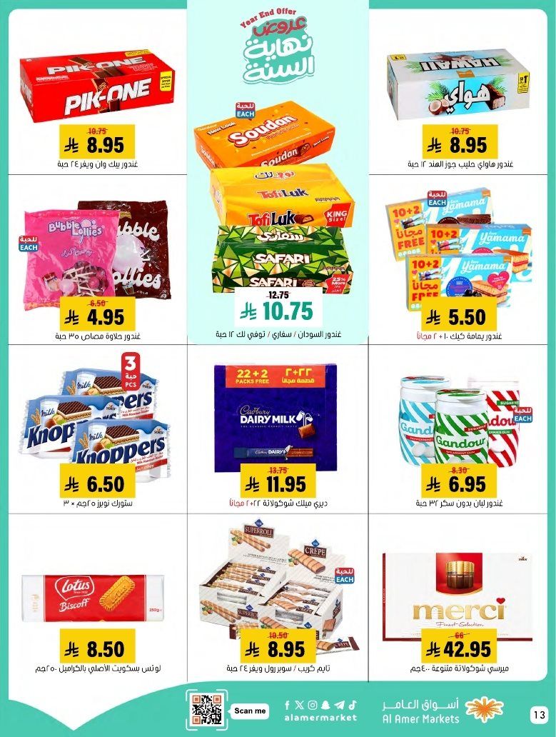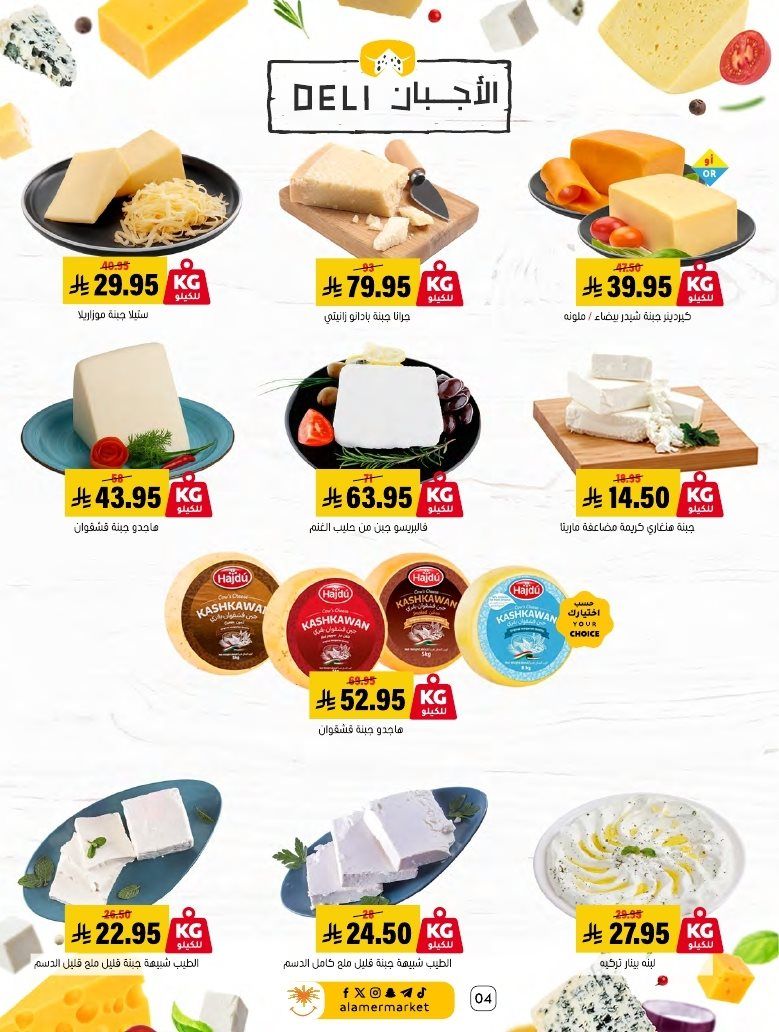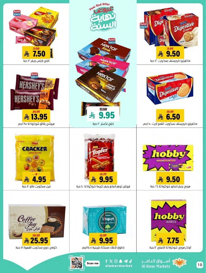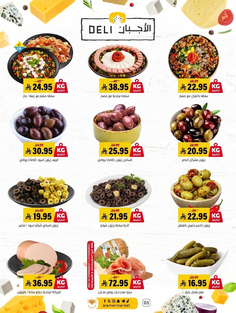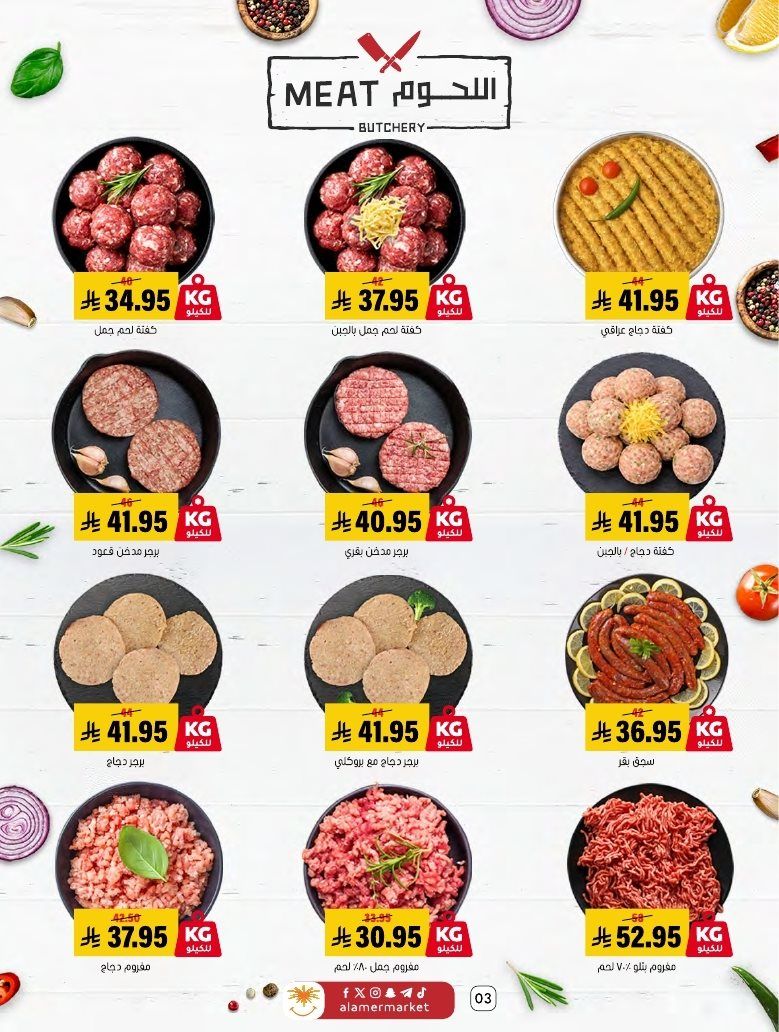 عروض اسواق العامر الاسبوعية السبت 7 رجب 1447هـ و تحتوي علي قطع اللحم بالعظم ولحم الغنم والسواكني والدجاج إضافة إلى تشكيلة من الكفتة والبرغر والسجق و بتوفر أيضا تشكيلة من الجبن والاجبان البيضاء والصفراء والقشقوان واللبنة والسلطات الجاهزة و منتجات البقالة الأساسية إضافة إلى البسكويت والمكرونة والمناديل