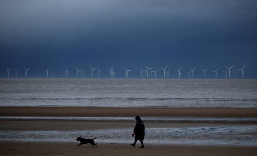 امرأة تمشي مع كلبها على الثلوج تحت سماء ملبدة بالغيوم فى