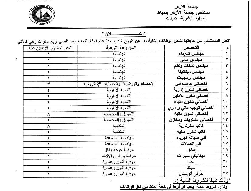 جامعة الأزهر مستشفى جامعة الأزهر بدمياط الموارد البشرية تعينات تعلن المستشفى عن حاجتها لشغل الوظائف التالية بعد عن طريق الندب لمدة عام قابلة للتجديد بحد أقصى أربع سنوات وهي كالأتي