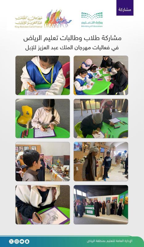 تشارك الإدارة العامة للتعليم بمنطقة الرياض في مهرجان الملك عبدالعزيز للإبل في نسخته العاشرة والذي يُقام خلال الفترة من 1 ديسمبر 2025 حتى 3 يناير 2026م.