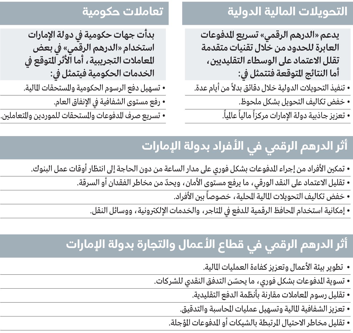 وستُسهم العملة الرقمية للمصرف المركزي، كونها جزءاً من جهود تحول دولة الإمارات إلى اقتصاد رقمي، في التخفيف من التحديات الحالية في المدفوعات المحلية وعبر الحدود، وتحقيق الشمول المالي، والوصول إلى «مجتمع لا نقدي»، كما ستُسهم في تعزيز البنية التحتية للمدفوعات في الإمارات، وتوفير قنوات إضافية قوية للمدفوعات المحلية والدولية، ما يضمن نظاماً مالياً مرناً وموثوقاً.