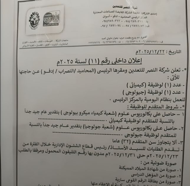 إعلان داخلي رقم (11) لسنة 2025 م تعلن شركة النصر للتعدين ومقرها الرئيسى المحاميد / النصراب / إدفو ) عن حاجتها للأتى :