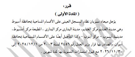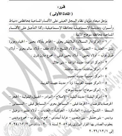 وقرار بتأجيل ميعاد سريان نظام السجل العيني على الأقسام المساحية بمحافظتي دمياط وأسوان، ومدينة الإسماعيلية بمحافظة الإسماعيلية، والتأجيل على الأقسام المساحية بمحافظة سوهاج الآتية: