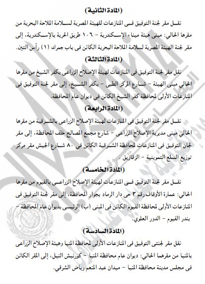 نقل مقر لجنة التوفيق في المنازعات لهيئة الإصلاح الزراعى بكفر الشيخكما قرر الوزير نقل مقر لجنة التوفيق في المنازعات لهيئة الإصلاح الزراعى بكفر الشيخ من مقرها الحالي مبنى الهيئة - شارع المركز الطبي - يكفر الشيخ إلى مقر لجنة التوفيق في المنازعات الأولى المحافظة كفر الشيخ الكائن في ديوان عام المحافظة، ونقل مقر لجنة التوفيق في المنازعات الهيئة الإصلاح الزراعي بالشرقية من مقرها الحالي مبنى مديرية الإصلاح الزراعي - شارع مجمع المصالح خلف المحافظة، إلى مقر لجان التوفيق في المنازعات المحافظة الشرقية الكائن في 80 شارع الجيش مقر مركز توزيع السلع التموينية - الزقازيق، ونقل مقر لجنة التوفيق في المنازعات الهيئة الإصلاح الزراعي بالفيوم من مقرها الحالي: عمارة الأوقاف رقم 3 حى دار الرماد بجوار المحافظة، إلى مقر لجنة التوفيق في المنازعات الأولى المحافظة الفيوم الكائن في المبنى (ب) الرئيسي بديوان عام المحافظة بندر الفيوم - الدور العلوي، ونقل مقر لجنتي التوفيق في المنازعات الأولى المحافظة المنيا وهيئة الإصلاح الزراعي بالمنيا من مقرهما الحالي: ديوان عام محافظة المنيا - كورنيش النيل، إلى المقر الكائن في مجلس مدينة محافظة المنيا - ميدان عبد المنعم رياض الشرقي.