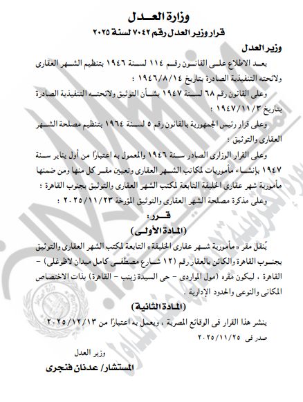 وقرار أخر بنقل مقر مأمورية شهر عقارى الخليفة التابعة لمكتب الشهر العقاري والتوثيق بجنوب القاهرة والكائن بالعقار رقم (12) شارع مصطفی کامل میدان لاظوغلی -القاهرة ، ليكون مقره مول المواردي - حي السيدة زينب - القاهرة، بذات الاختصاص المكاني والنوعي والحدود الإدارية.