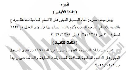 تأجيل ميعاد سريان نظام السجل العينى على الأقسام المساحية بمحافظة أسيوطونشرت الجريدة قرار وزير العدل بتأجيل ميعاد سريان نظام السجل العينى على الأقسام المساحية بمحافظة أسيوط وهي مدينة الغنايم مركز الغنايم، مدينة البداري مركز البداري ، المطيعة مركز أسيوط مدينة أبنوب - مركز أبنوب - والتأجيل أيضا على الأقسام المساحية بمحافظة أسوان، والصادر بها قرار وزير العدل رقم 2456 لسنة 2003 مع قبول استمارات التسوية بها لمدة شهرين، وتأجيل ميعاد سريان نظام السجل العينى على الأقسام المساحية بمحافظة سوهاج بالنسبة للأقسام المساحية السقرية وكوم بدار ، الصادر بها قرار وزير العدل رقم2134 لسنة 2001.