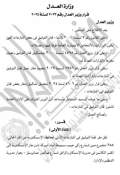 نقل مقر لجنة التوفيق في المنازعات الأولى المحافظة الإسكندريةونقل مقر لجنة التوفيق في المنازعات الأولى المحافظة الإسكندرية من المقر الحالي: 288 متفرع من شارع زكى حبيب سموحة أمام شركة تاون جاز الإسكندرية إلى المقر الكائن في مديرية الإسكان والمرافق شارع فيكتور عمانويل - بجوار مديرية التنظيم والإدارة، ونقل مقر لجنة التوفيق فى المنازعات للهيئة المصرية السلامة الملاحة البحرية من مقرها الحالي: مبنى هيئة ميناء الإسكندرية - 106 طريق الحرية بالإسكندرية، إلى مقر لجنة الهيئة المصرية لسلامة الملاحة البحرية الكائن في باب جمرك (1) رأس التين.