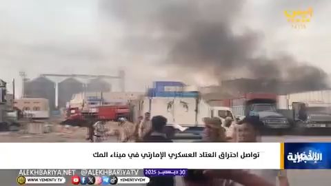 بيّن مقطع فيديو نشرته قناة الإخبارية آثار احتراق عتاد وكميات من الأسلحة الإماراتية المهرّبة عبر ميناء المكلا، وذلك عقب الضربة السعودية التي استهدفت تلك المواقع.